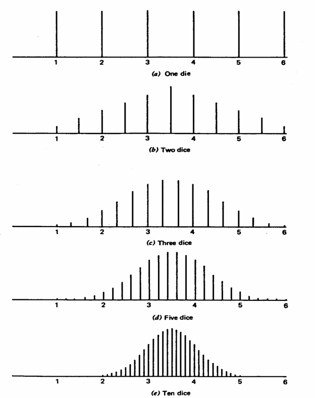 In molti testi di statistica, tale concetto è presentato didatticamnente con l’esempio di lanci ripetuti di un dado, in quanto di facile rappresentazione grafica, come nella figura riportata nella pagina successiva e già descritta nel capitolo sulle distribuzioni teoriche. - Se lanciamo un dato solo (figura a - one die), i 6 numeri escono con la stessa probabilità: - Se lanciamo due dadi (figura b - two dice) e dividiamo per due il numero ottenuto con il lancio, i valori possibili da 1 a 6 aumentano, hanno una distribuzione simmetrica e i valori centrali sono più frequenti quelli centrali. - Se il numero di dadi diventa tre (figura c - three dice) o ancor più con cinque dadi (figura d - five dice) e calcoliamo sempre le medie ottenute, i valori possibili aumentano ancora , mantenendosi sempre nei limiti di 1 e 6: La figura assume sempre più una forma normale, gli estremi diventano poco frequenti. - Con dieci dadi (figura e - ten dice), la forma della distribzuione delle medie è già perfettamente normale. In conclusione: - i numeri di ogni dado hanno una distribuzione rettangolare, quindi lontana dalla normalità; - ma le medie di k dadi hanno una distribuzione normale.