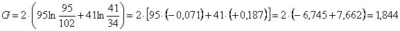 G = 2 x{[(5 x 1,609) + (2 x 0,693) + (1 x 0) + (3 x 1,099) + (10 x 2,303) + (1 x 0) + (5 x 1,609) + + (2 x 0,693) + (4 x 1,386) ] - - [(8 x 2,079) + (14 x 2,639) + (11 x 2,398) + (13 x 2,565) + (14 x 2,639) + 6 x 1,792)]+ + [(33 x 3,497)]}