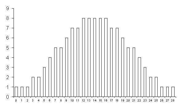Frequenze (in ordinata, su 128 casi possibili) dei valori di T (in ascissa) con N = 7 e due ties.